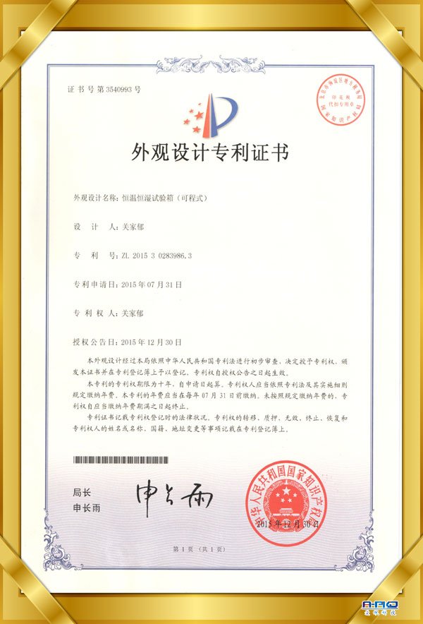 图片名称:恒温恒湿试验箱外观设计专利证书 图片来源:http://www.aipei17.com 作者:爱佩科技 1314
