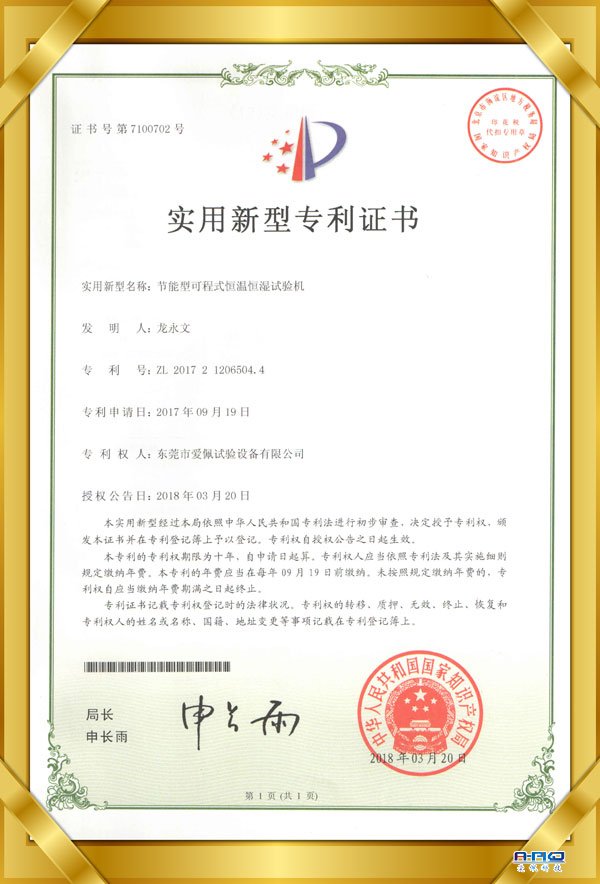 图片名称:节能型可程式恒温恒湿试验机实用新专利证书 图片来源:http://www.aipei17.com 作者:爱佩科技 1322