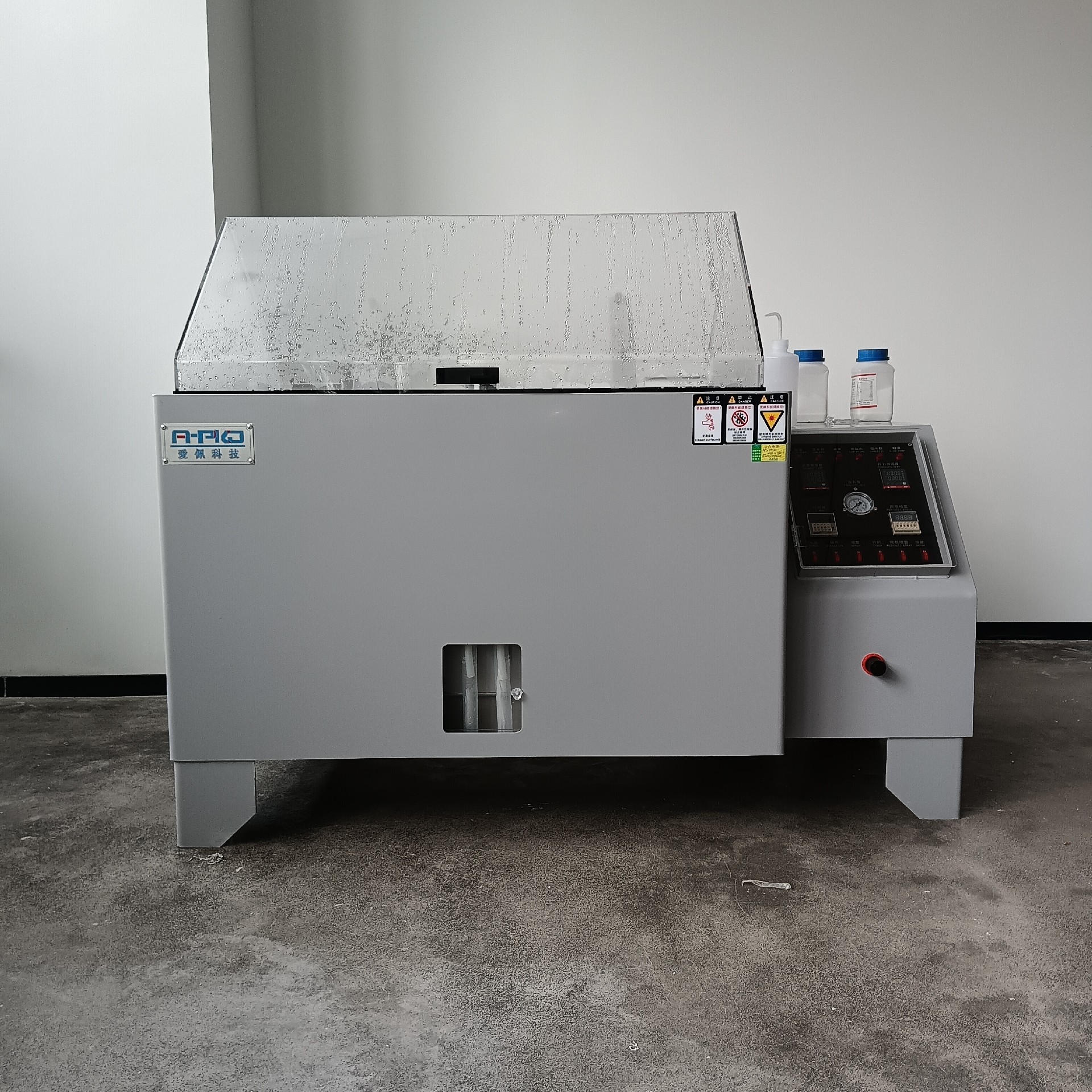 由于箱盖材料为优质透明PVC板材,所以可以从外部清楚地观察到盐雾测试区内的试件状况,不但不影响试验结果,更加不影响人身安全与环境破坏。并且箱盖设计成110度最佳顶角,使试验过程中产生的冷凝水不会滴落到测试物上影响试验结果。箱盖与箱体采用水密封,从而保证绝对影响试验结果和腐蚀室内其它设备,甚至可能对试验操作人员造成的伤害也不会存在。小型箱盖为手动式,大型盐雾腐蚀试验箱的箱盖采用台湾进口气缸自动开启,方便自如。开启角度约80度,也可根据客户特殊情况另行设计,气源可以采用压缩空气,压力为0.4兆帕。